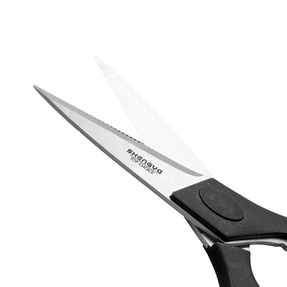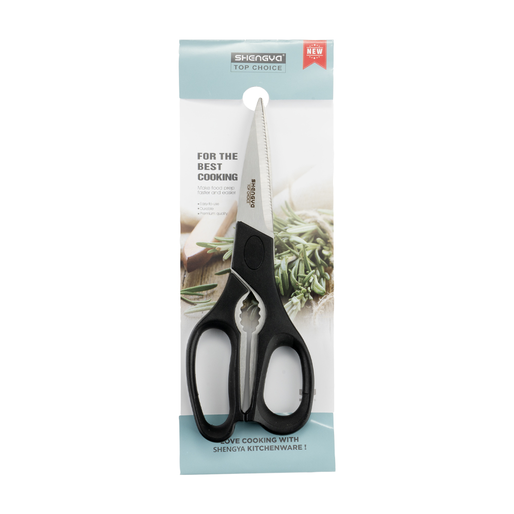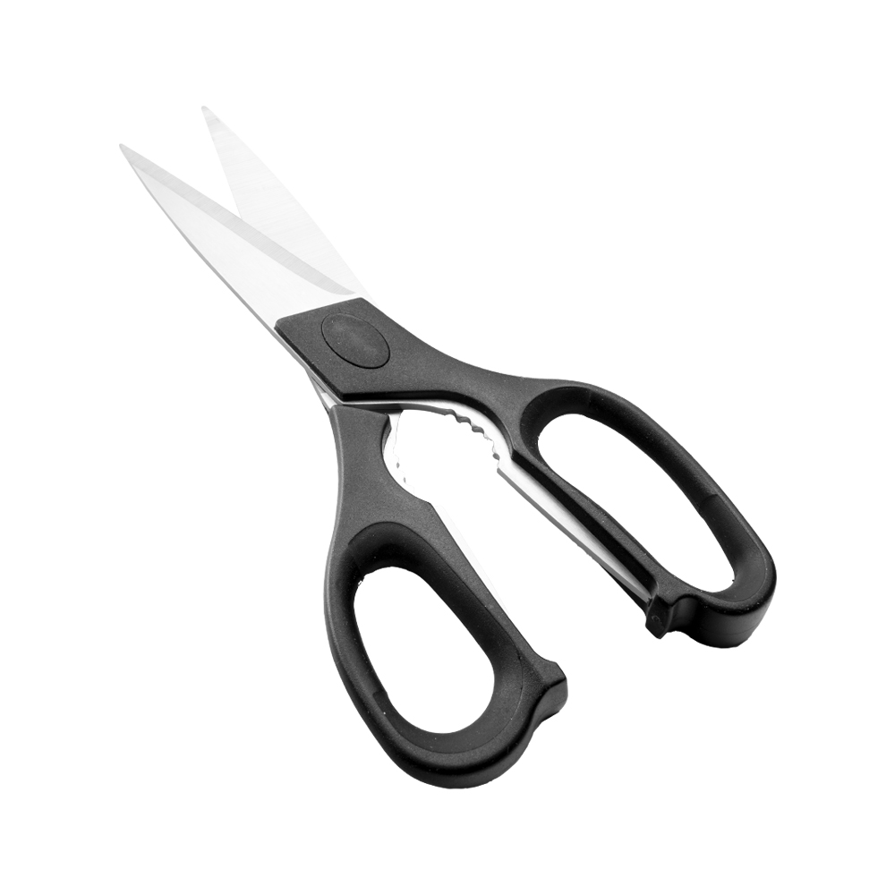قیچی آشپزخانه دسته پلاستیکی فشرده و تیغه استیل ضد زنگ دارد. این قیچی قابل استفاده برای برش نان، سبزی، میوه، گوشت، مرغ و دیگر مواد غذایی است. همچنین از دندانههای داخل دسته این ابزار میتوان برای شکستن کردو و دیگر آجیلها استفاده کرد.