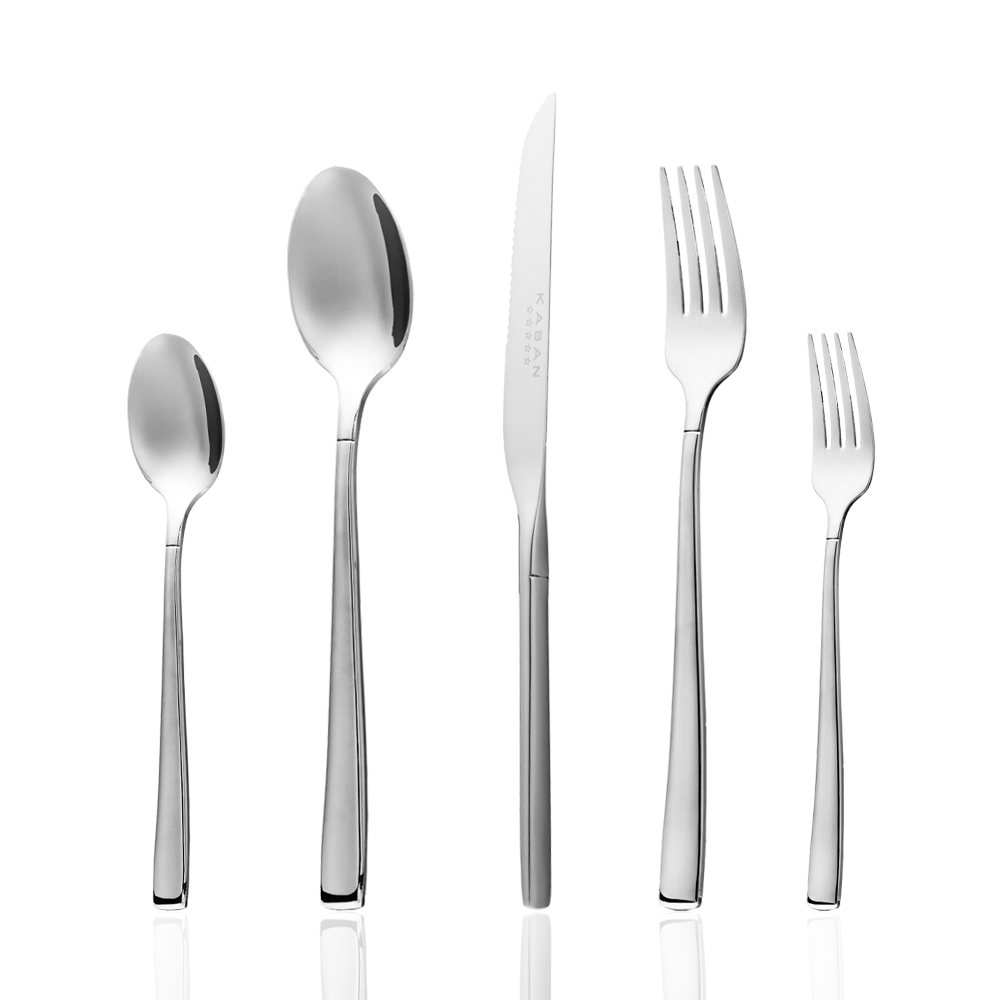 ست قاشق و چنگال استیل کابان مناسب پذیرایی از 30 نفر و قابل استفاده در مهمانیهای بزرگ و دورهمیهای کوچک است. این ست شامل قاشق، چنگال، چنگال میوه، قاشق چای خوری، مرباخوری و شربت خوری، خورشت خوری، انبر سالاد، کفگیر، کارد و ملاقه میشود.